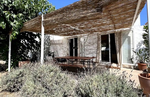 Casa de una sola planta, con espacios diáfanos y accesibilidad, amplia cocina comedor, salón con proyector y pantalla, espacio con instrumentos musicales, ducha al aire libre, y un gran espacio exterior con una amplia mesa bajo pérgola de cañizo ideal para las noches de verano. Kids-friendly, con una cabaña para los niños, columpio, juguetes…
