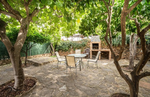 Patio con mobiliario, barbacoa y vistas a la Sierra de Gata