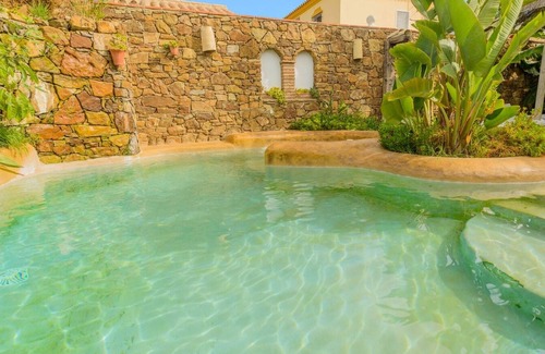 La zona exterior dispone de un magnífico porche de 6 m2 caracterizado por vigas de madera antigua, que da acceso directo a las zonas compartidas entre los cuatro apartamentos y el estudio de este estupendo cortijo rural. Aquí usted podrá relajarse tomando el cálido sol de Andalucía en las cómodas tumbonas del amplio jardín, refrescarse con sus amigos o pareja en la espectacular piscina de arena con cascadas, Jacuzzi y ducha exterior, y comer deliciosas parrilladas cocinadas en la coqueta zona de barbacoa.