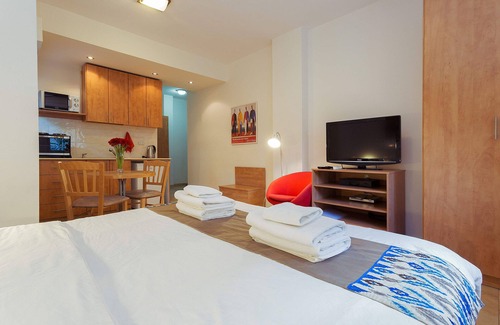 El estudio consta de un espacio abierto. Si uno decide cenar, el supermercado está en la siguiente esquina. La cocina funcional está equipada con utensilios suficientes para preparar comidas ligeras. Además de la microonda, hay dos tapas eléctricas fáciles de utilizar de la estufa un pequeño horno y un refrigerador compacto. Tenga en cuenta que las ollas de cocina son kosher lácteos.