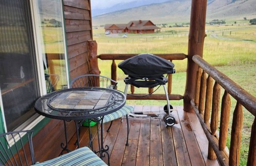 La cabaña se asienta sobre una loma con vista a las montañas en todas las direcciones y vislumbres del río Yellowstone hacia el oeste. Disfruta de tu refresco favorito en el porche cubierto mientras el sol se pone y proyecta su resplandor rosado en las montañas ante ti.