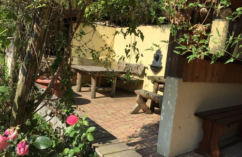 El jardín contiguo con muchos asientos y una zona de barbacoa de ladrillo completa la imagen con estilo. Descanse en el verde bajo los manzanos o tome el sol en la terraza (el jardín está disponible exclusivamente para nuestros huéspedes de la casa Romance para uso común)
