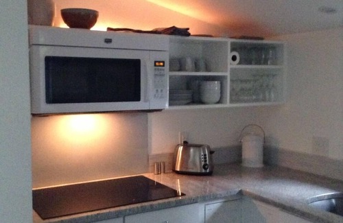 La moderna cocina está totalmente equipada, con encimeras de granito blanco de Cachemira, rango de inducción, horno de microondas / convección, filtro de agua de dos etapas, cafetera, tostadora, hervidor de agua de vidrio con apagado automático automático, lavaplatos y refrigerador debajo del mostrador.