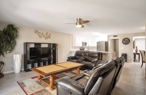 Esta unidad es una casa adosada muy espaciosa de 2 habitaciones / 2 baños, en 1 nivel y sin escaleras. 1 habitación king y 1 habitación queen. Es realmente genial para familias y parejas en un vecindario seguro y tranquilo que buscan escapar a un clima más cálido y experimentar lo que el desierto tiene para ofrecer. Cuenta con 2 dormitorios y baños separados, ideal para 2 parejas. Tiene un patio trasero de buen tamaño para perros y un patio para barbacoas y relajarse por la noche. La casa tiene mucha iluminación de claraboya natural y esta casa es muy espaciosa y cómoda. Hay ropa interior - lavadora / secadora. La piscina comunitaria climatizada y el jacuzzi están a pocos pasos de distancia. La unidad está bien equipada con todos los elementos esenciales; Ropa de cama, toallas, almohadas, platos y utensilios de cocina, cafetera, tostadora, tabla de planchar / plancha, microondas, lavavajillas, horno / estufa, refrigerador, etc. Satélite e internet proporcionados.