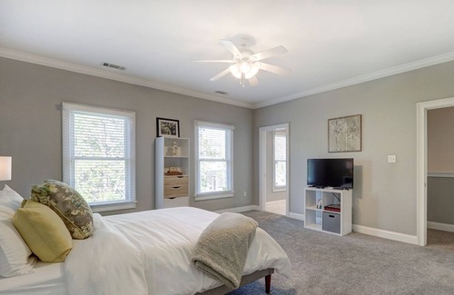 Ubicado a solo unas cuadras del infame Parque Forsth, East Park Retreat Main + Carriage House presenta una oportunidad única de tener un acceso cercano a uno de los lugares históricos de Savannah. Como uno de nuestros alquileres vacacionales más grandes en Savannah, la propiedad ofrece espacio para 10 huéspedes de más de 2,816 pies cuadrados, que incluye la casa principal y la cochera. En total, la propiedad cuenta con cuatro habitaciones en total, con tres baños y medio. La casa principal tiene la mayor parte del espacio, que incluye una cocina gourmet, un comedor con capacidad para seis personas, una sala de estar, una sala separada, tres dormitorios, dos baños completos, un medio baño y una lavadora y secadora. Un dormitorio tiene una cama queen con baño en suite, la segunda habitación tiene una cama king y la tercera tiene una queen. Un colchón de aire está disponible para su uso en los espacios comunes. La casa principal y la cochera están conectadas por una terraza exterior y un patio de ladrillo con parrilla de gas. En la cochera, encontrarás una sala de estar con TV de pantalla plana, cocina completa, dormitorio doble, baño completo con bañera y ducha combinadas, y lavadora y secadora.