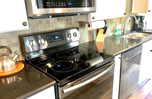 Este 1100 pies cuadrados. El apartamento incluye una suite doble con dos habitaciones semiprivadas separadas por un recorrido. Está ubicado en el primer piso de nuestra casa, mientras vivimos en el segundo piso. También hay una cocina completamente equipada con todas las comodidades del hogar que podamos imaginar.