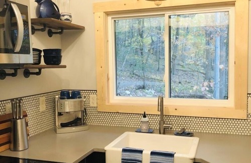 El dormitorio principal cuenta con una cama doble y un gran ventanal con vistas al bosque, además de un baño privado con ducha de efecto lluvia y calefacción por suelo radiante. El dormitorio de invitados también ofrece una cama tamaño queen y estanterías hechas a mano que brindan un generoso espacio de almacenamiento para todo su atuendo de escapada. El loft snug es el lugar perfecto para acurrucarse con un libro, jugar un juego o ver una película, y también ofrece espacio adicional para dormir con un futón reina muy cómodo.