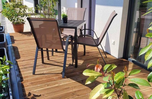 The kitchenette offers a fridge, coffee maker, and kettle, while the stylish bathroom features a walk-in shower, premium toiletries, and plush towels. Enjoy high-speed Wi-Fi, a smart TV, climate control, and a private terrace with garden views but only 50m from the beach.
