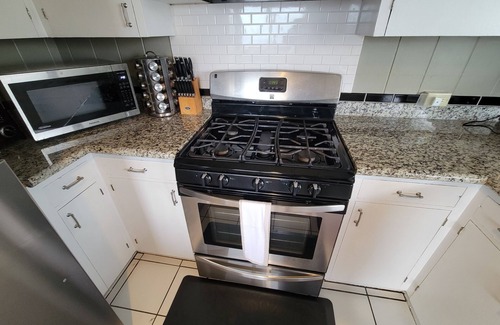 La cocina cuenta con electrodomésticos de acero inoxidable, cocina / horno a gas, microondas, olla arrocera, cafetera y tostadora..