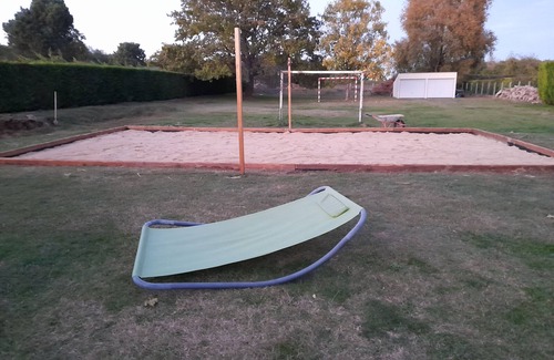 Exterior: gran recinto cerrado y privado con pista de petanca, campo de voleibol playa, campo de fútbol y cama elástica.