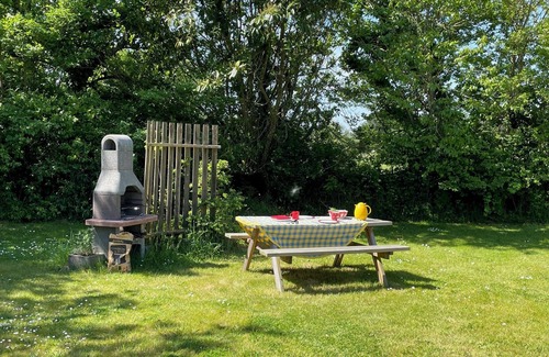 En frente de la cabaña hay un gran jardín compartido con tumbonas y una barbacoa compartida.