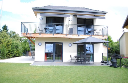 Balcón con una pequeña mesa y dos sillas. La casa también tiene un jardín en la planta baja donde se puede disfrutar de la barbacoa.