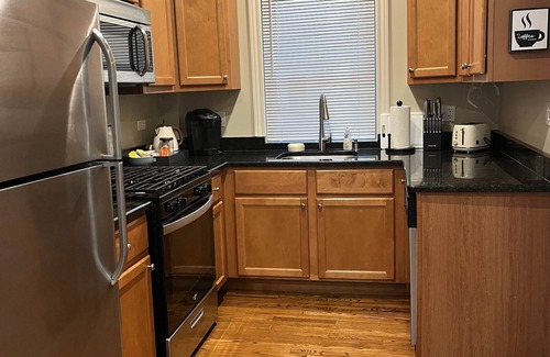Get ready to be impressed with this newly rehabbed, charming 2-bedroom vintage home close to downtown Evanston, NU, and the beach. The first floor is open and airy with freshly refinished hardwood floors throughout. There is a spacious dining room that seats six; a sunny living room with wood-burning fireplace, built in bookshelves, smart tv, and additional seating that converts to a twin bed for more sleeping space; and a well-stocked full kitchen with wood cabinets, stainless steel appliances, and granite countertops. The second floor has two queen bedrooms (one with a work area) and a full bath with a bathtub. Tasteful mid-century details can be found throughout this modernized 100-year-old brick cottage. Other amenities: washer/dryer, high speed Wi-Fi, off-street parking, small private yard, central AC throughout. This property is perfect for small groups and families.