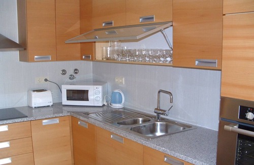 Una puerta del salón / comedor conduce a una cocina bien equipada separada que tiene un horno eléctrico y vitrocerámica, microondas, nevera / congelador, lavavajillas, lavadora, hervidor eléctrico, tostadora y cafetera.
