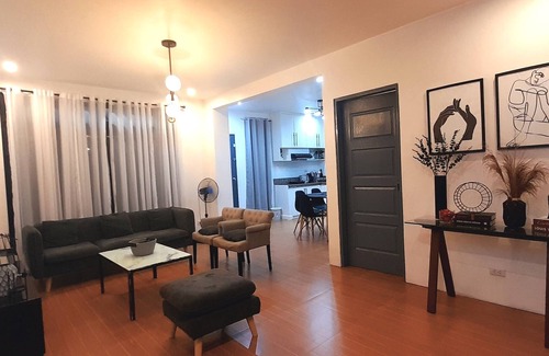 We are introducing our spacious two-bedroom apartment in Cebu City, Philippines. Perfect for families or groups of friends, it comfortably accommodates 6-12 guests. Our 100 sqm floor area residence provides a home away from home experience. We take pride in offering high-speed Wi-Fi access to our guests, with an impressive 400 Mbps internet speed, to ensure you remain connected and productive during your stay. We cordially invite you to reserve your stay with us and indulge in the convenience and comfort of our charming residence. This living space is a perfect blend of spaciousness, and with comfy furnishings. The comfortable sofas provide an ideal spot for relaxing and bonding with others, while the open floor plan seamlessly unites the living and dining areas. The dining area features a 6-seater table and offers an intimate setting for sharing meals. Our generous and well-furnished kitchen is thoughtfully crafted to foster a practical and efficient cooking environment, enabling you to effortlessly produce the most scrumptious dishes while enjoying the process of culinary creativity. Retreat into our expansive two-bedroom suite and indulge in the tranquil comfort of our elegantly appointed sleeping quarters. The primary bedroom features a generously sized queen bed, while the second bedroom boasts two double-decker beds, providing ample space for a restful and rejuvenating slumber. Awaken feeling invigorated and prepared to tackle the day ahead. You'll be delighted that we've covered your parking, ensuring a hassle-free arrival and departure experience. Plus, stay connected with lightning-fast internet access available throughout your stay. The Banawa neighborhood is known for its lively atmosphere and offers a variety of dining options, entertainment venues, banks, and shopping destinations that are easily accessible.
