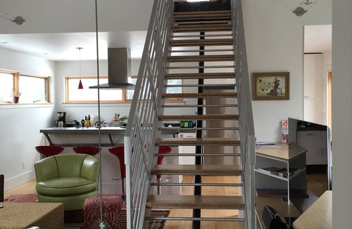 SLEEPING LOFT: se accede a través de una escalera giratoria (¡pequeño proyecto galardonado a nivel nacional!); cama doble, cama individual, silla tapizada y tocador. Un espacio muy acogedor.