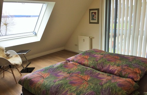 El dormitorio con cama de matrimonio se encuentra en la planta superior. Desde aquí podrá disfrutar de la maravillosa vista del lago temprano en la mañana. Otras dos personas pueden dormir en el sofá desplegable de la sala de estar.