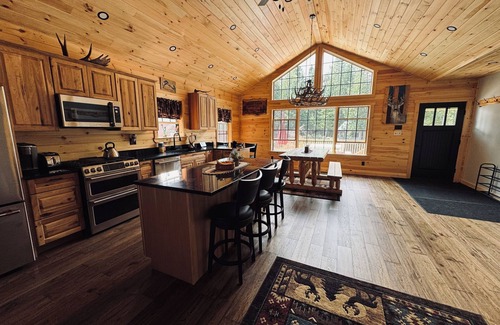 Cabin features three bedrooms and a loft, will comfortably sleep 8-10 people. Brand new large addition is finished on the inside. Located on Flagstaff lake with water access for all you swimming, boating, kayaking, snowmobiling desires. Close to town making it convenient to eat out, or shop. Just 10 minutes from Sugarloaf, making it a great destination for skiers. The long driveway gives you the privacy you want to escape, enjoy, and relax. Beautiful covered porch with a propane fireplace, is the perfect spot to unwind at any time of the day. Hot tub is included for guests. Kayaks included for guests. BBQ grill included for guests. Dock included for guests. Fenced in yard, and pet friendly!