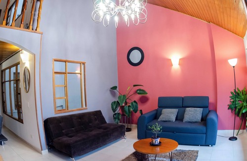 En plena Zona Gourmet de Chapinero, este apartamento de dos pisos, de techos altos y lámparas colgantes sorprende con su estilo cálido y único.