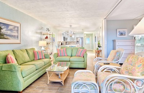Frente al golfo Condo! Entra en este colorido primer piso totalmente remodelado condominio y relaja tus preocupaciones lejos. Esta dos dormitorios, dos cuartos de baño, la playa y del Golfo frente condominio tiene todo lo necesario para unas excelentes vacaciones. La nueva cocina abierta con gabinetes blancos, encimeras de granito y electrodomésticos de acero inoxidable. Los nuevos pisos de tablones de cuarzo en todo el condominio brindan una hermosa sensación de playas. Disfrute de sus comidas en la mesa de comedor grande y blanca con seis hermosas sillas azules y una lámpara de coral. El gran colorido salón tiene un televisor de pantalla plana, dos cómodos sofás y dos sillas. El dormitorio principal tiene una cómoda cama de matrimonio y puede ser abierto o cerrado a la sala de estar con la pared plegable. El baño principal tiene un amplio espacio de guardarropas, tocadores nuevos, duchas con azulejos de vidrio y encimeras de cuarzo. Sus amigos y familiares se sientan cómodos en el baño de invitados con dos camas individuales y baño adjunto. El baño de invitados cuenta con un nuevo tocador blanco, encimeras de cuarzo y una ducha con azulejos de vidrio. Relajar los días de distancia de los sonidos del océano en la gran terraza que está a pocos pasos de la playa. Un brillante, muy bien decorado condominio frente a la playa para las vacaciones perfectas.