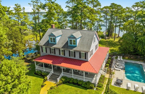 La hermosa envoltura alrededor de los porches incluye un área de comedor al aire libre con vista a la piscina. El compuesto fue diseñado como sueño de propietarios, e incluye una piscina, amplias cubiertas para el entretenimiento, una playa preciosa, entorno natural privado y zonas de paso para el pantano adyacente. Imponentes pinos taeda, cedros aromáticas y hierbas del pantano salpican el paisaje. Hay un estanque de marea situada al lado de la casa podrán descansar de cisnes, patos, gansos y. El muelle se extiende 200 pies en el río con 3 amarres para botes y asientos para su disfrute. Abunda la fauna; usted puede encontrarse cangrejos y la pesca durante todo el día. Sí, nuestra pesca de cangrejos es excelente!