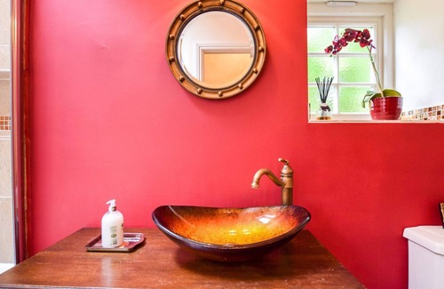 Este baño luminoso y luminoso tiene paredes de color magenta profundo de colores vivos y cuenta con una bañera de tamaño completo con ducha fija, un impresionante lavabo lacado en dorado colocado en un tocador antiguo, un inodoro y toallero eléctrico. (Este baño sirve como el baño a la habitación 4).
