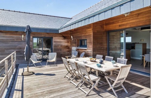 Casa de arquitecto construida en 2008. Piscina cubierta de 7 x 4. Nuestra casa está ubicada en el borde de los campos con una vista totalmente despejada. La sala de estar, la cocina, el comedor (unos 70m2) y la suite parental (25 m2) con vigas a la vista, se encuentran arriba y dan a una gran terraza de 70m2 en PEI con una vista dominante de la naturaleza. El acceso a la playa PEN GUEN es a través de un camino costero; se tarda entre 5 y 10 minutos dependiendo de su ritmo ... 4 habitaciones en la planta baja también se abren a una terraza Ipe y permiten el acceso a la piscina. El quinto dormitorio da a los campos. La piscina se calienta todo el año entre 26 y 28 ° C; Su acceso está totalmente asegurado por una puerta con cerradura. Una sala de TV, con una pantalla LCD de 94 cm y cómodos sofás te espera para momentos de descanso. La cafetera Nespresso queda disponible. Wifi.