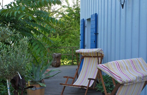La hermosa terraza de madera grande rodea la casa por dos lados. Puede llegar a ellos a través de la terraza y a través de la puerta principal. Está equipado con una mesa con ocho sillas, dos tumbonas, una sombrilla y una hamaca. En verano, nuestros olivos y agaves contribuyen a una maravillosa sensación de vacaciones.