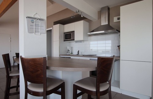 Una vez pasada la entrada y el pasillo que conduce a los dormitorios y baños, descubrimos la sala de estar alrededor de la cocina totalmente equipada. Para ayudarlo a preparar buenas comidas, encontrará una placa de inducción, horno, microondas, frigorífico-congelador y lavavajillas. Para empezar bien el día, hay una tetera, una cafetera de filtro y una tostadora para disfrutar de un buen desayuno.