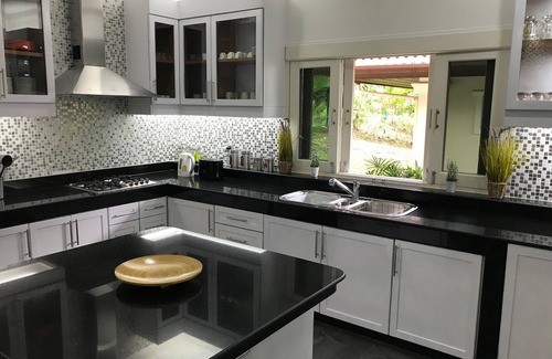 Desde el área de recepción ingresa a la gran sala de estar con TV de 50 "y sistema de sonido Bose. Camine hasta el comedor formal con mesa y sillas para 12 personas, donde podrá cenar con estilo y vistas a la piscina. Una ventana de concertina se abre a la gran cocina europea totalmente equipada que convenientemente tiene una isla / barra de desayuno con capacidad para dos.
