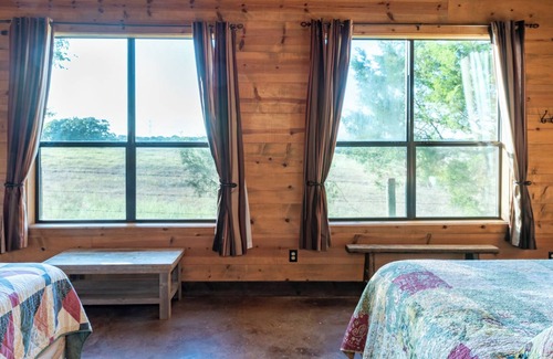 The bedroom features a comfy king-sized bed facing a big picture window. Enjoy great views of the hill country while sipping coffee in bed.