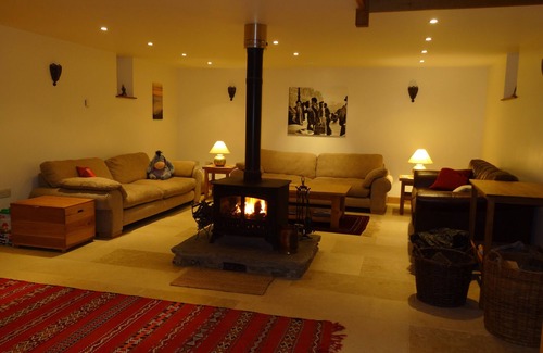 Gran sala de estar abierta con estufa de leña (multi combustible), TV, DVD y asientos cómodos.