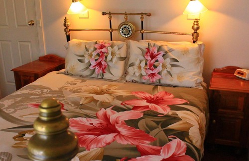 Duerma en una cama tamaño queen en una de nuestras habitaciones con baño privado y muebles antiguos. La cabaña independiente de dos dormitorios tiene instalaciones de cocina completas y tiene capacidad para hasta cinco personas.