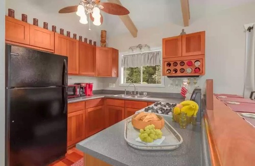 La artesanía hermosa abunda en nuestra habitación de un dormitorio (más un cómodo sofá cama), baño mejorado en la hermosa comunidad de Volcano. Desde el bar tallado hasta la chimenea de roca de lava y la bañera de hidromasaje con jacuzzi, hemos prestado atención a cada detalle. Las puertas francesas desde la sala de estar y el dormitorio le brindan una gran cantidad de vida interior / exterior. Juegue con herraduras en la parte de atrás, acomódese bajo las estrellas y disfrute de la fogata, o cree una cena gourmet para disfrutar en el lanai privado: ¡siéntase como en casa!
