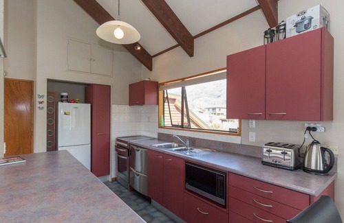 Esta casa de vacaciones de 2 pisos en Wanaka incluye una cálida y acogedora sala de estar de planta superior - el amplio salón, el comedor y la cocina aseguran un amplio espacio para que su grupo pueda relajarse y descansar o cocinar fiestas familiares, con una chimenea de barril para mantenerse tostado durante su invierno retirada. Cuando el clima es más cálido, disfrute de la gran terraza con un área protegida donde puede cenar al aire libre con comodidad. ¡Encienda la barbacoa y vea las dulces escenas del lago! Una bomba de calor tanto en la planta alta como en la planta baja garantiza una comodidad adicional durante todo el año.