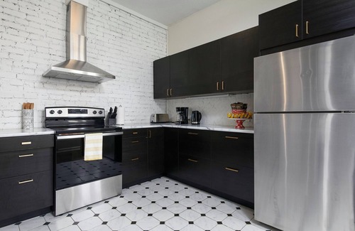 Prepare cualquier plato en una cocina nueva y moderna de Cook's Delight. Este gran apartamento ubicado en Le Plateau, que es el lugar más buscado para vivir como un lugar en el corazón de la ciudad y estamos ubicados en solo 1 de solo 2 calles oficiales para alquileres de casas permitidas con permisos. Taburetes de bistró tejidos a mano, únicos y soñadores, paredes de ladrillo auténtico, blancas, auténticas, blandas, techos altos y la suave luz de la mañana, rodeada de arte original.