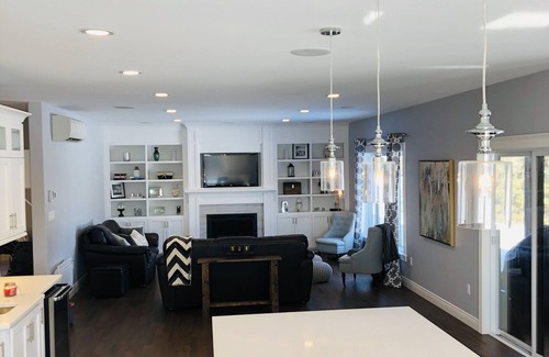 Esta casa de 4000 pies cuadrados tiene 2 años de antigüedad y cuenta con una cocina de concepto abierto con barra húmeda incorporada, sala de estar, comedor y medio baño en el piso principal. La cocina cuenta con una gran despensa, electrodomésticos de acero inoxidable y una isla de 10 pies con encimeras de cuarzo. La gran isla y la mesa de comedor de 6 pies ofrecen muchos asientos para cenas familiares. Fuera de la cocina hay una terraza cubierta con bar-b-que y amplios asientos. Arriba, incluye un amplio dormitorio principal con vestidor y baño privado con una gran bañera de hidromasaje y ducha con chorros. Además, el segundo tiene 2 dormitorios más y un baño completo con bañera / ducha. Lavadero con lavadora y secadora completa el piso de arriba. El sótano terminado incluye el cuarto dormitorio, otro baño completo y una gran televisión de pantalla plana de 80 pulgadas que permite grandes noches de cine. Wifi y cable disponibles en toda la casa con enrutadores adicionales arriba para mantener Internet de alta velocidad.