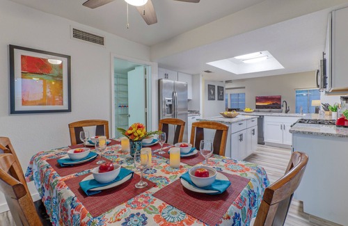 Cocina amplia y completamente equipada con isla que se abre a la zona de comedor y al rincón. El espacio del mostrador es abundante para preparar y servir su cocina favorita y se han agregado nuevos elementos de cocina. comedor para seis personas y cuenta con vistas al patio trasero y agradecidos de campo de golf. puertas correderas dobles en cada extremo de la cocina hacen transferencia de comida y bebida al patio y zona de la piscina fácil y eficiente. El tocador en el primer piso agrega comodidad para los huéspedes que usan el billar, está recién pintado y tiene tocador, cómoda y accesorios nuevos. El sofá cama Queen en el rincón de la cocina ofrece dormitorios adicionales si es necesario.