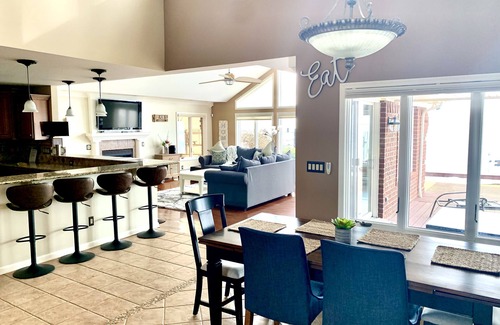 Nuestra hermosa casa tiene un concepto abierto con vistas al lago desde casi todas las habitaciones. La casa consta de 4 dormitorios (dos de los cuales tienen baño privado), 4 baños en total, una gran cocina, sala de estar abierta, comedor y gran entrada abierta. ¡Una de nuestras cosas favoritas sobre el hogar es el gran camino de entrada y la cantidad de privacidad que tenemos! ¡Esta será una estancia inolvidable para usted y sus seres queridos!