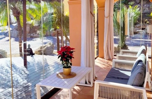 Esta hermosa y elegante villa moderna se encuentra dentro de sus propios jardines privados de palmeras tropicales y ofrece las vistas más increíbles. Directamente en frente tiene el mar hacia Gibraltar, el Mediterráneo y África, mientras que detrás de la villa tiene la Cordillera de Sierra Nevada. La villa está construida con la calidad en mente y es absolutamente perfecta para aquellos que desean disfrutar de una ubicación totalmente tranquila, pacífica y relajante en un entorno "lejos de todo" en hermosos jardines con una piscina privada más que decente y sol. camas, mientras que se encuentra a poca distancia en coche de la ciudad de Estepona. El establecimiento solo está disponible durante un mes completo en invierno.