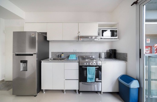Este apartamento nuevo, de 1 recamara, cuenta con una cocina completamente equipada con nevera y un sofá cama súper cómodo en la sala de estar.