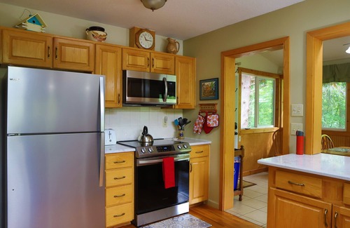 La casa, con sus techos altos y espectaculares magníficos pisos de roble real está amueblada con un toque de elegancia país. El nivel de entrada incluye una cocina totalmente equipada, amplio comedor-abierto con una tabla de país grande que fácilmente asientos 10, y una gran sala con un sofá seccional grande ubicada frente a la chimenea de piedra. El otro extremo de la gran sala incluye un comedor adicional con una hermosa mesa y sillas.