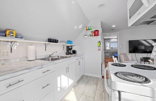 La cocina está equipada con horno, placa de cocina y frigorífico, además de cafetera y tetera, microondas y utensilios de cocina. Conéctate al wifi, o relájate frente a televisión. Y no tendrás que llevarte ropa de más, porque podrás aprovechar la lavadora y la secadora. Otras comodidades de este alojamiento de 1 dormitorio y 1 baño incluyen ropa de cama, una tabla de planchar, aire acondicionado y calefacción.