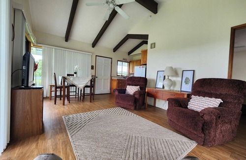 Disfrute de la belleza tranquila que rodea esta propiedad. Desde la cubierta, quedará cautivado por la vista de Mauna Kea y la vegetación tropical que rodea el terreno. Incluso hay un césped para hacer un poco de práctica seria de poner. Un rápido viaje de cinco minutos lo llevará a la costa y al centro de Hilo.
