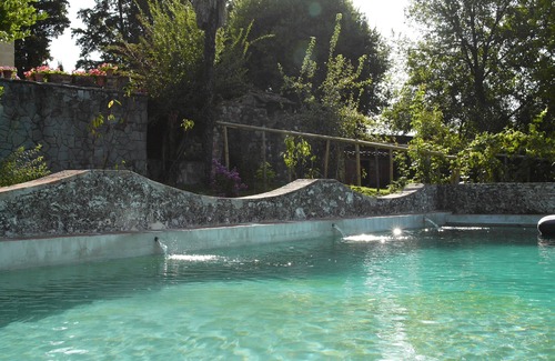 Hay una zona de comedor y una terraza, una gran piscina, hamacas para aquellos que prefieren la sombra, un huerto encantador.