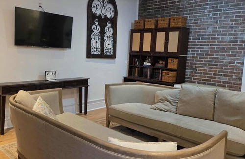 Inside, you’ll find room for everyone with 1 king, 2 queens, 1 full, and 2 twin beds, plus plenty of gathering space to relax together. The home blends its historic character — hardwood floors, fireplace, and architectural details — with modern comforts like central AC/heat, WiFi, and well-equipped bathrooms (all with showers and hair dryers).