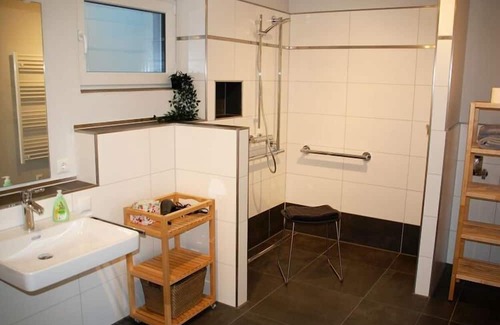Visit our new holiday apartments in tranquil Baudenbach. Our holiday apartment on the ground floor is barrier-free and largely suitable for wheelchair users. In addition to a small shower room, this apartment also offers a large bathroom. Designed for people with wheelchairs and special needs for comfort. A spacious covered terrace invites you to linger and also offers you proximity to our alpacas. Modern box spring beds and a fully equipped kitchen complete our offer.