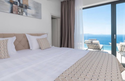 The architecture of the ground floor is designed to maintain fluidity between the living room, kitchen and dining room, as these most commonly used rooms are here designed as open space in order to remain as spacious as possible. The impression of freedom and airiness is contributed by the soothing colours of the interior design, but also the glass walls, as well as the glass fences that allow the viewer to enjoy the fascinating view that surrounds him! The villa offers 4 bedrooms, each with its own ensuite bathroom. One of the bedrooms is located on the ground floor for easier access, while the others are located upstairs.