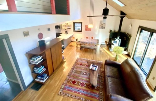 Inside, open, loft-like, cathedral ceilings + 3 bdrms, en suite; free-standing tub & jacuzzi tub; wood-burning fireplace, new well-equipped kitchen, casual, Upstated design. Sleeps 6. Surrounded by nature.