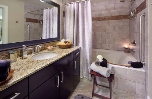 The 1-bedroom features a king bed in the master bedroom and a queen sleeper sofa in the living area, providing a cozy yet roomy retreat. A fully equipped kitchen, in-suite washer and dryer, private balcony, and a fireplace offer all the comforts of home while keeping you close to all the action.